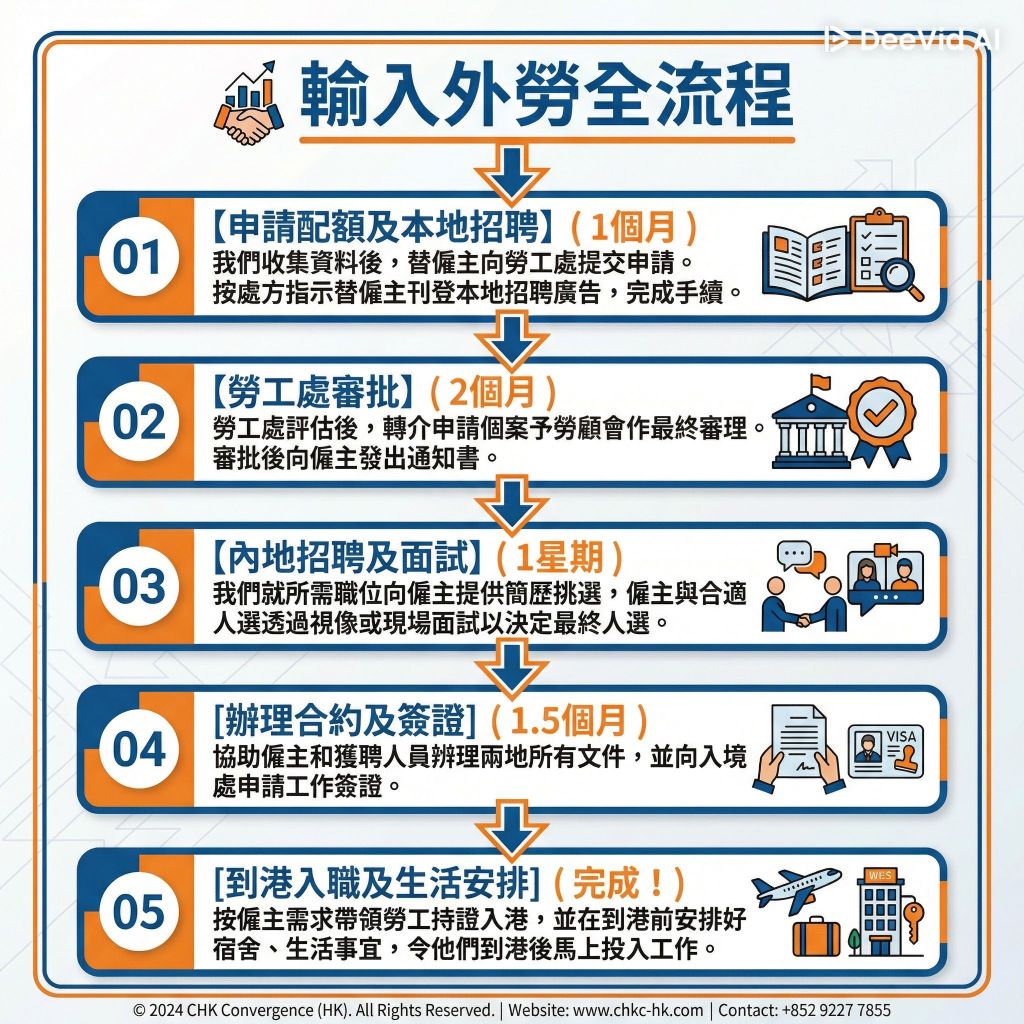 我們替僱主和受聘的外勞們全程指導並完成兩地的簽署合約和辦證事宜,包括和雙方簽署「標準僱傭合約」表格(LD294)、辦理 14 家國企有關文件、遞交香港入境處資料等。